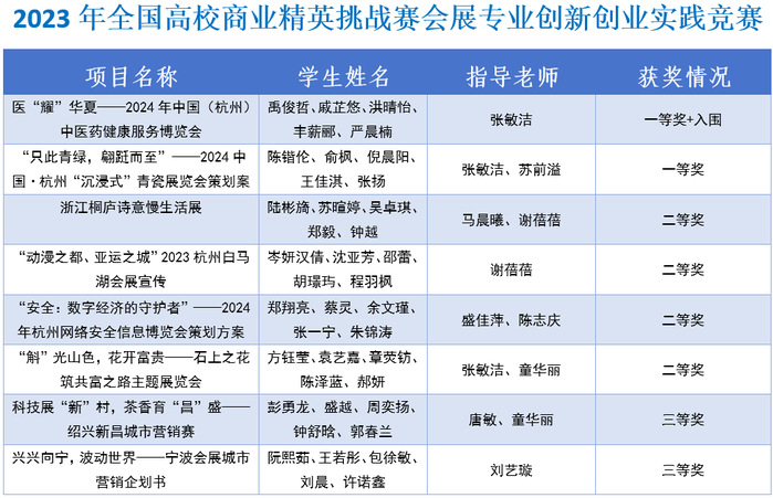 初赛阶段共吸引了来自全国30个省(自治区、直辖市)和特别行政区的526所高校近5200支队伍30000余名(含知识赛)学生报名参加。在知识赛、院赛、全国总决赛分组赛、精英赛的激烈角逐中,我院学子充分展现了良好的技能与素养。由张敏洁老师指导,禹俊哲、戚芷悠、洪晴怡、丰薪郦、严晨楠同学共同完成的《医“耀”华夏——2024年中国(杭州)中医药健康服务博览会》荣获国家级一等奖,并入围了2023年(新加坡)国际商务会展策划大赛精英赛;由张敏洁、苏前溢老师指导,陈锴伦、俞枫、倪晨阳、王佳淇、张扬同学共同完成的《“只此青绿,翩跹而至”——2024中国·杭州“沉浸式”青瓷展览会策划案》荣获国家级一等奖;由马晨曦、谢蓓蓓老师指导,陆彬旖、苏暄婷、吴卓琪、郑毅、钟越同学共同完成的《浙江桐庐诗意慢生活展》获得国家级二等奖;由谢蓓蓓老师指导,岑妍汉倩、沈亚芳、邵蕾、胡璟玙、程羽枫同学共同完成的《“动漫之都、亚运之城”2023杭州白马湖会展宣传》获得国家级二等奖;由盛佳萍、陈志庆老师指导,郑翔亮、蔡灵、余文瑾、张一宁、朱锦涛同学共同完成的《“安全:数字经济的守护者”——2024年杭州网络安全信息博览会策划方案》获得国家级二等奖;由张敏洁、童华丽老师指导,方钰莹、袁艺嘉、章荧钫、陈泽蓝、郝妍同学共同完成的《“斛”光山色,花开富贵——石上之花筑共富之路主题展览会》获得国家级二等奖;由唐敏、童华丽老师指导,彭勇龙、盛越、周奕扬、钟舒晗、郭春兰同学共同完成的《科技展“新”村,茶香育“昌”盛——绍兴新昌城市营销赛》获得国家级三等奖;由刘艺璇老师指导,阮熙茹、王若彤、包徐敏、刘晨、许诺鑫同学共同完成的《兴兴向宁,波动世界——宁波会展城市营销企划书》获得国家级三等奖。