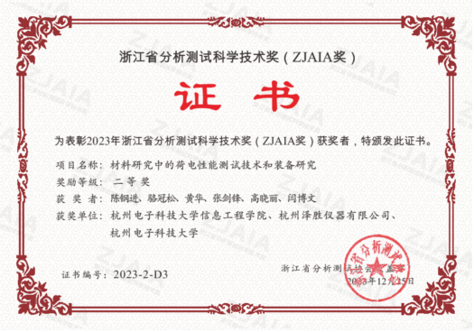 近日,由我院特聘教授陈钢进博士主持、与杭州泽胜仪器有限公司和杭州电子科技大学等单位合作的“材料研究中的荷电性能测试技术和装备研究” 项目荣获浙江省分析测试科学技术奖二等奖。