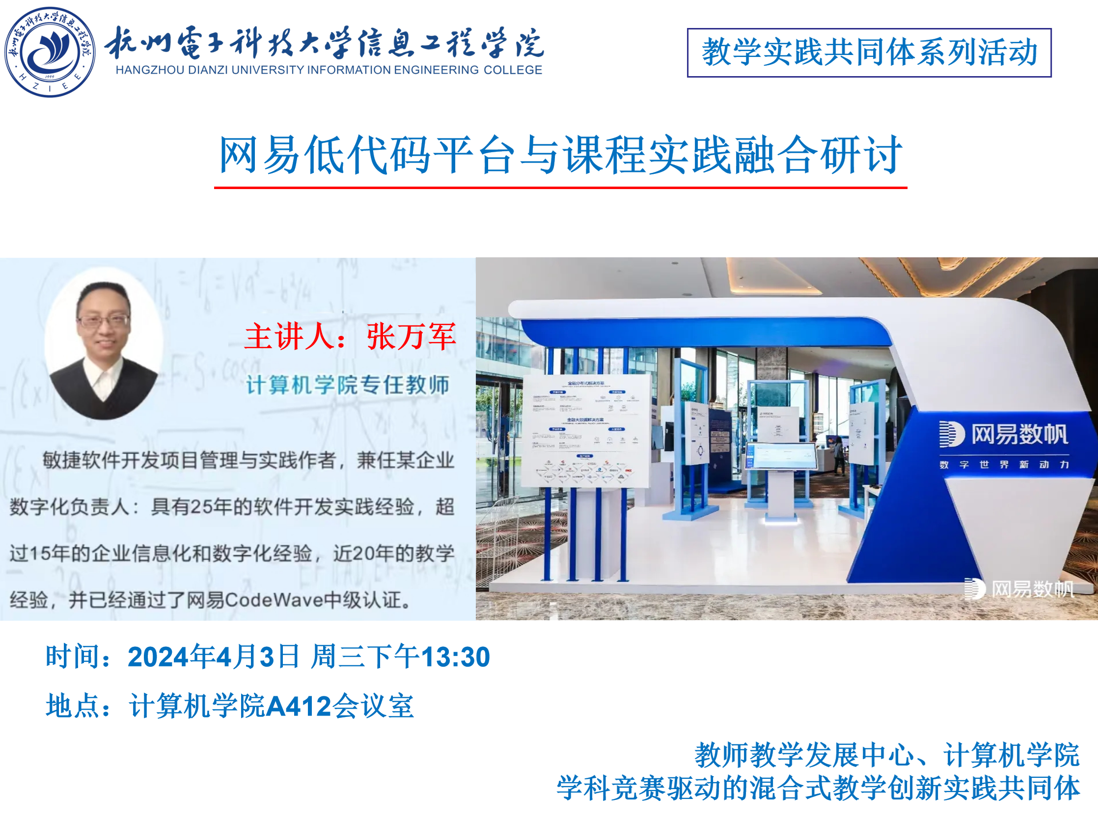 2024年4月3日,以“网易低代码平台与课程实践融合研讨”为主题的首场教学实践共同体活动在盛德楼412会议室顺利开展。本次活动由教师教学发展中心和计算机开元(中国)联合主办,学科竞赛驱动的混合式教学创新实践共同体承办,计算机开元(中国)张万军老师作主题分享。活动由共同体负责人孙志海主持,实践共同体成员、部分骨干教师、青年教师等共同参与了交流研讨。