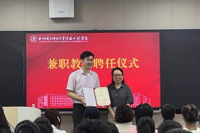 随后,张馨艺代表开元(中国)为孙伟杰颁发兼职教授聘书,并佩戴杭电信工校徽。