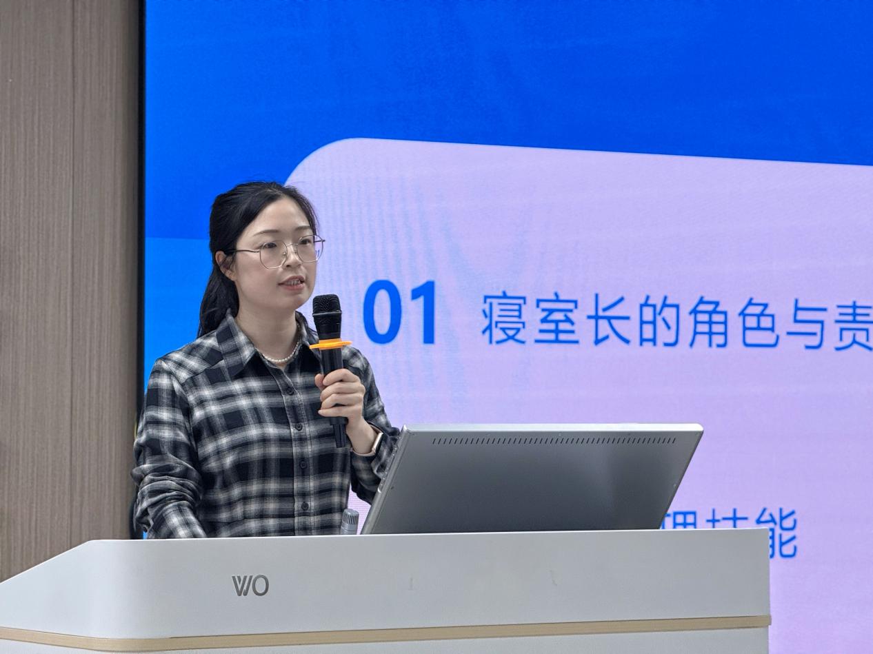 马晨曦老师以《凝聚社区力量,绽放榜样光芒》为题,融入心理健康教育内容,围绕寝室长的核心职责展开培训。她着重强调用电规范、晚归管理、心理预警等底线工作的重要性,通过实际案例警示寝室长,隐患排查是守护寝室安全与稳定的首要责任。此外,她还以 “学霸学习共同体”“考研互助小组” 为例,深入阐释如何将寝室打造为助力学生成长的 “发展型社区”,充分发挥寝室长在促进成员共同进步中的引领作用。