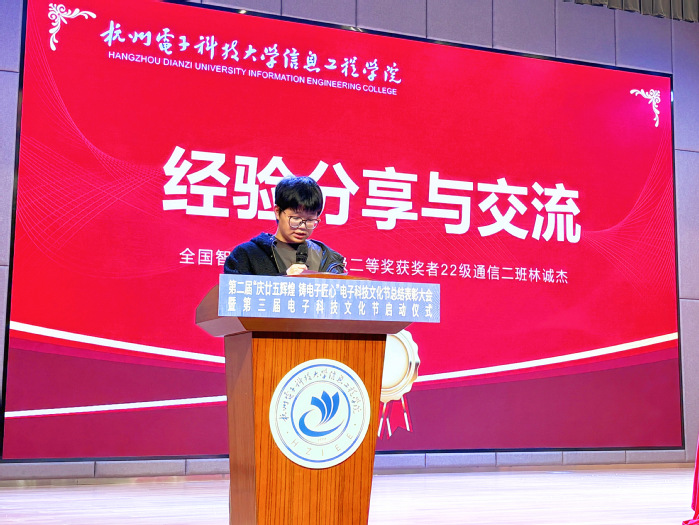 随后,2022级通信二班的林诚杰作为代表分享竞赛心得。他表示备赛过程虽挑战重重,但磨炼了意志、提升了技术,更收获了情谊与热爱。他鼓励同学们积极参与竞赛,勇于挑战,绽放电子科技之光彩。