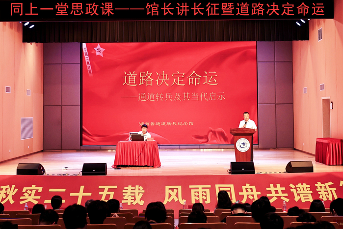 郑湘以丰富的历史史料和生动的叙事,围绕“道路探索:路在何方”“道路抉择:通道转兵”“道路自信:守正创新”三个维度,系统讲解了红军长征“通道转兵”的决策过程、历史意义及新时代启示。郑湘指出,通道转兵彰显的实事求是、敢于斗争、独立自主、勇于担当精神,具有深刻的历史教育意义与实践指导价值。郑湘强调,通道会议的召开,是中国革命史上一件极其重要的大事。它是我党思想认识上的一次觉醒,是马克思主义中国化时代化的一次生动实践,在指明前进方向、保存武装力量、提供领导保障等方面具有十分重要的意义。