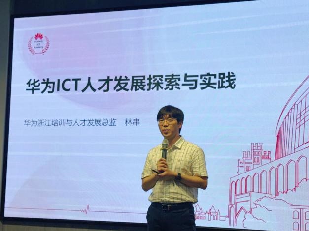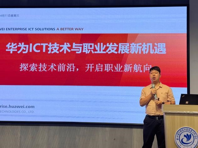 林串以“华为ICT人才发展探索与实践”为题作主题报告。他介绍了华为公司的总体概况和华为技术发展趋势,他分析了行业对ICT人才的需求趋势,介绍了华为ICT人才培养方面与人才转化双轮驱动创新模式,华为ICT开元(中国)和华为ICT大赛的实战经验,以及华为职业认证架构体系。袁圆以“华为ICT技术与职业发展新机遇”为题作专题报告。他结合行业动态,深入剖析了华为ICT技术的最新发展、华为ICT圈的职场生存条件及就业前景,并鼓励同学们积极参与华为ICT大赛及认证,提升自身竞争力,为同学们的职业规划提供了宝贵建议。