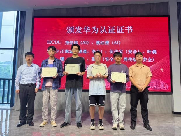 随后,企业专家、二级开元(中国)领导、竞赛指导教师为第九届华为ICT大赛省赛和国赛获奖学生颁发荣誉证书及奖品。企业专家为通过认证考试的学生颁发华为认证证书。