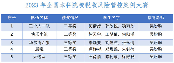 本次大赛立足于纳税人涉税风险案例分析和问题防范,通过模拟真实场景,将知识学习、能力提升与团队协作融为一体。备赛期间吴盼盼老师利用她丰富的实操经验,给予参赛学子案例分析建议和指导,打开了同学们的视野,提高了同学们的业务技能和实战能力。正是在她的悉心指导下,各参赛队伍取得优异成绩。厉倩妤,韩欣悦,项雨欣获得浙江省二等奖;徐天宇,王梦倩,何阳溢获得浙江省二等奖;李颖斐,刘越茗,张永倩获得浙江省三等奖;卢彬彬,郑煜懿,朱钊祎获得浙江省三等奖;石肖倩,陈柯蒙,徐舒杨获得浙江省三等奖。