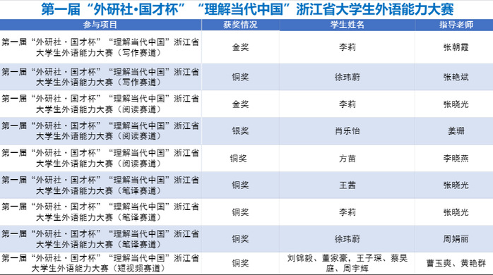 10月28日,2023年第一届“外研社·国才杯““理解当代中国”外语能力大赛全国阅读、写作、笔译竞赛浙江赛区决赛在学校圆满落幕,11月5日,短视频大赛浙江赛区决赛圆满结束。经过激烈角逐,我院在写作比赛中荣获金奖1项,铜奖1项;在阅读比赛中荣获金奖1项,银奖1项,铜奖1项;在笔译比赛中荣获铜奖3项;在短视频大赛中获得铜奖1项!