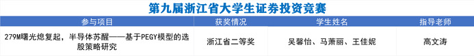 大学生证券投资竞赛团队以“公开、公平、公正”为原则,以“展现当代大学生知识智慧,培养科学投资理财观念”为宗旨,为广大学子提供了一个展现专业素质和综合风采的良好平台。我院学子踊跃报名参加,最终,由高文涛老师指导,吴馨怡、马萧丽、王佳妮同学组成的队伍取得浙江省二等奖的优异成绩。