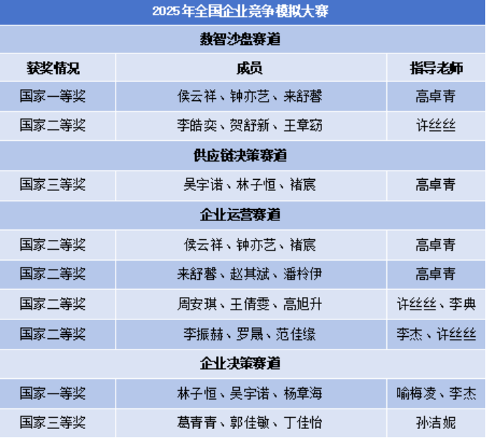 5月16日—18日,2025年全国企业竞争模拟大赛国赛在西南财经大学成功举办。我院学子在本次比赛中获得了2个国家一等奖,5个国家二等奖的好成绩,2个国家三等奖共计9个奖项的好成绩!