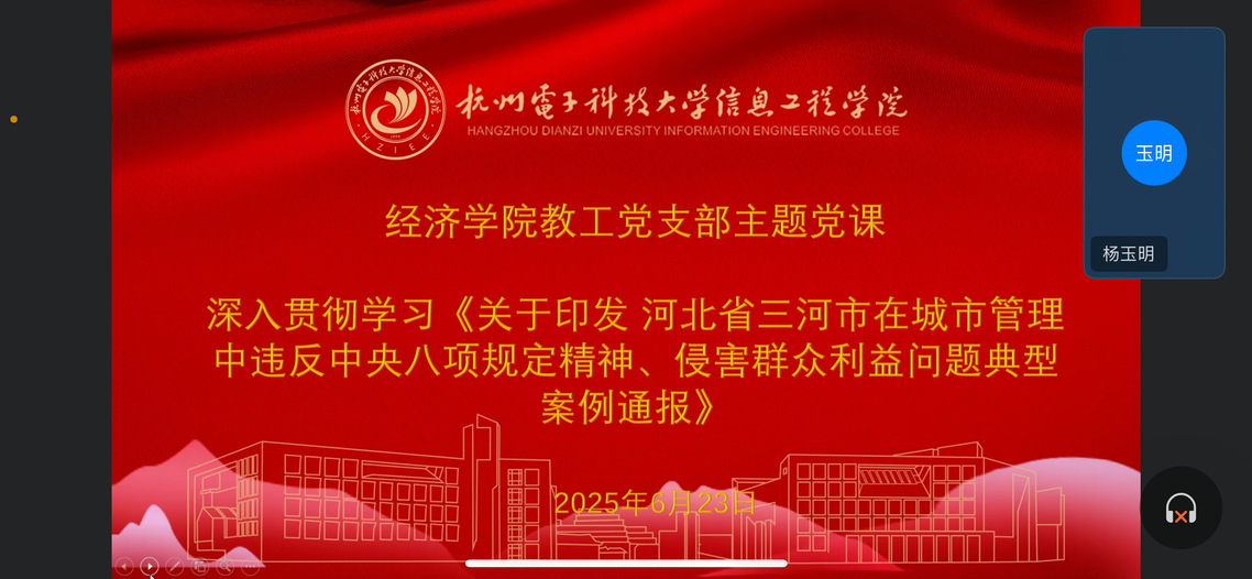 杨玉明首先带领全体党员深入学习了《关于集中整治违规吃喝的通知》文件精神。杨玉明结合当前形势和高校教师工作实际,详细解读了违规吃喝问题的具体表现、严重危害以及整治要求,强调全体党员务必提高政治站位,深刻认识整治违规吃喝问题的重要性、紧迫性,自觉抵制歪风邪气,坚决守住纪律红线此外,杨玉明组织全体党员学习《关于印发河北省三河市在城市管理中违反中央八项规定精神、侵害群众利益问题典型案例通报》。通过对发生在三河市的具体、鲜活案例的剖析,杨玉明深刻揭示了违反中央八项规定精神的严重后果以及侵害群众利益行为的恶劣影响,为全体党员敲响了警钟。他要求大家务必引以为戒,时刻绷紧廉洁自律这根弦,做到知敬畏、存戒惧、守底线。