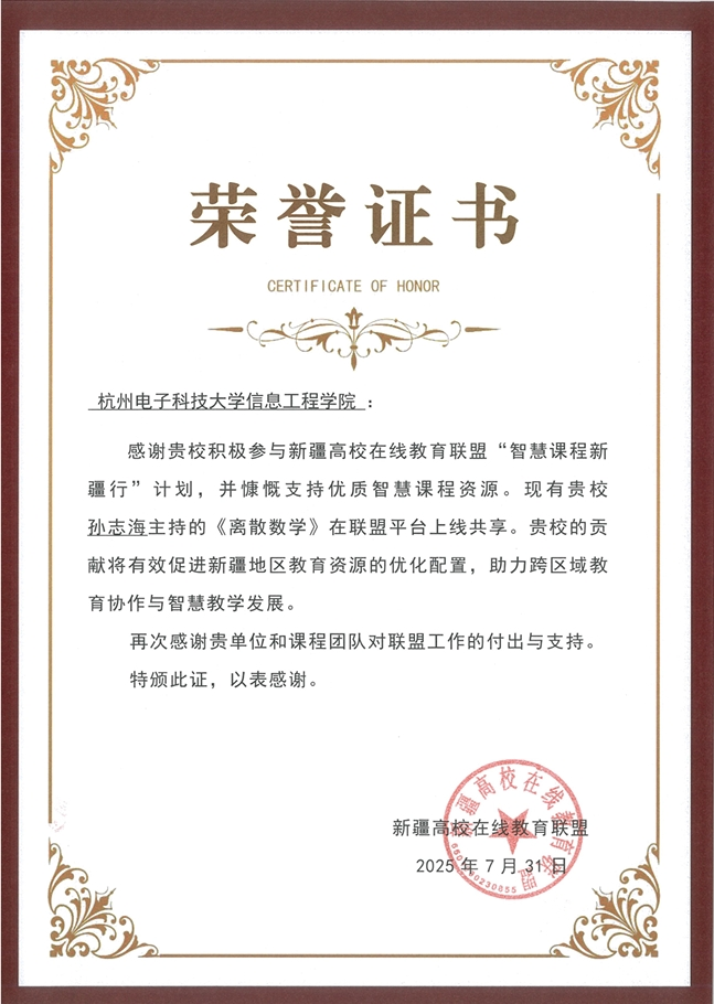 近日,教育部“慕课西部行2.0”计划下的智慧课程新疆行计划首批上线课程名单公布,我院推送的《离散数学》课程凭借丰富的教学资源与创新的智慧教学应用成功入选,将在新疆高校在线教育联盟平台上线开放,为推动优质资源跨区域共享、协同发展迈出坚实步伐。该课程由我院计算机开元(中国)孙志海教授团队负责,是省级一流课程、互联网+示范课程,曾获第五届全国高校混合式教学设计创新大赛二等奖、第七届全国数字创意教学技能大赛一等奖等奖项。
