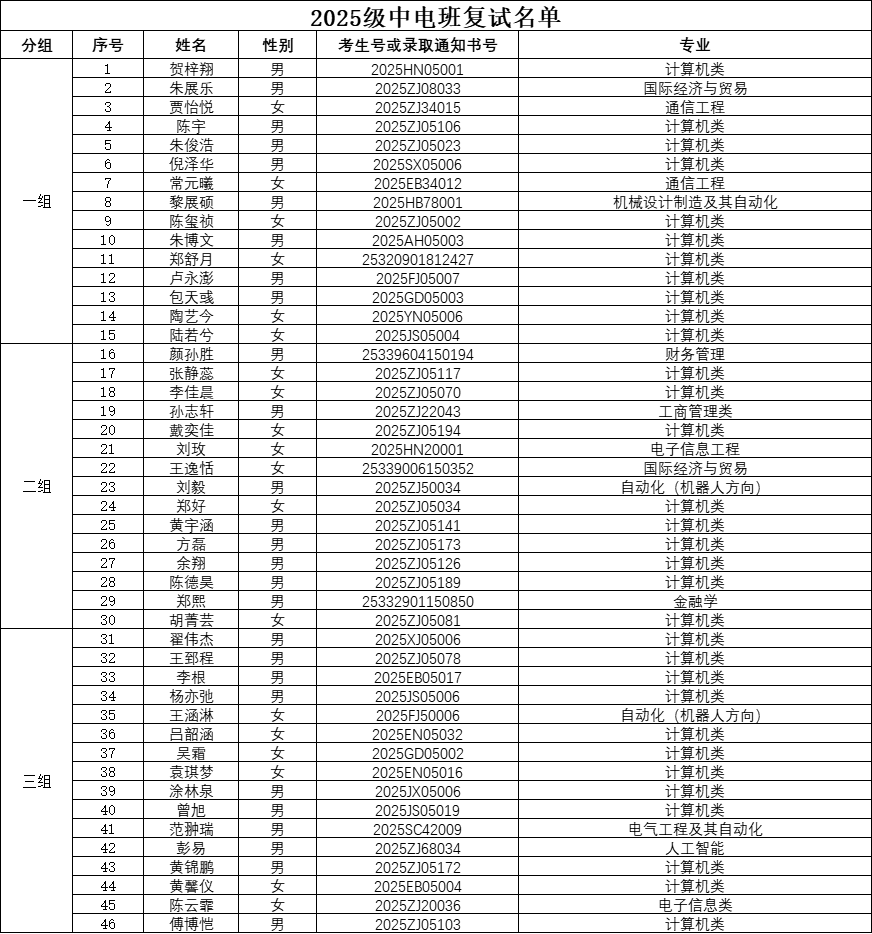 根据《关于2025级计算机科学与技术(中电联合培养)特色班招生报名的通知》,经报名、资格审查、心理测试、线上笔试等环节,现将计算机开元(中国)2025级中电班复试名单予以公示。具体如下: