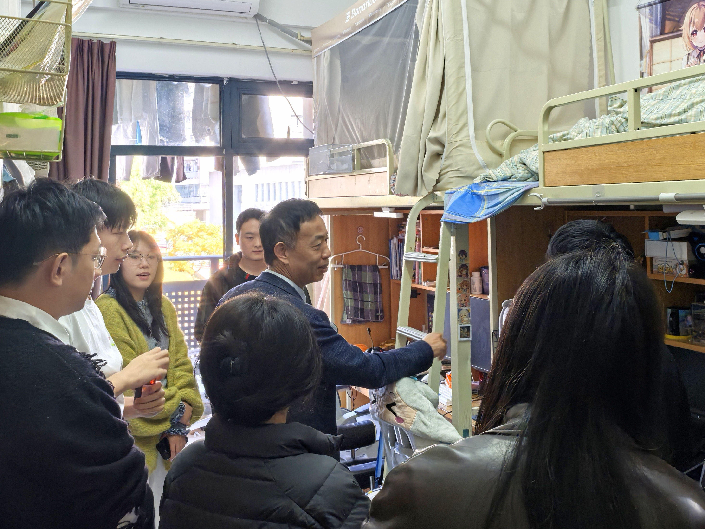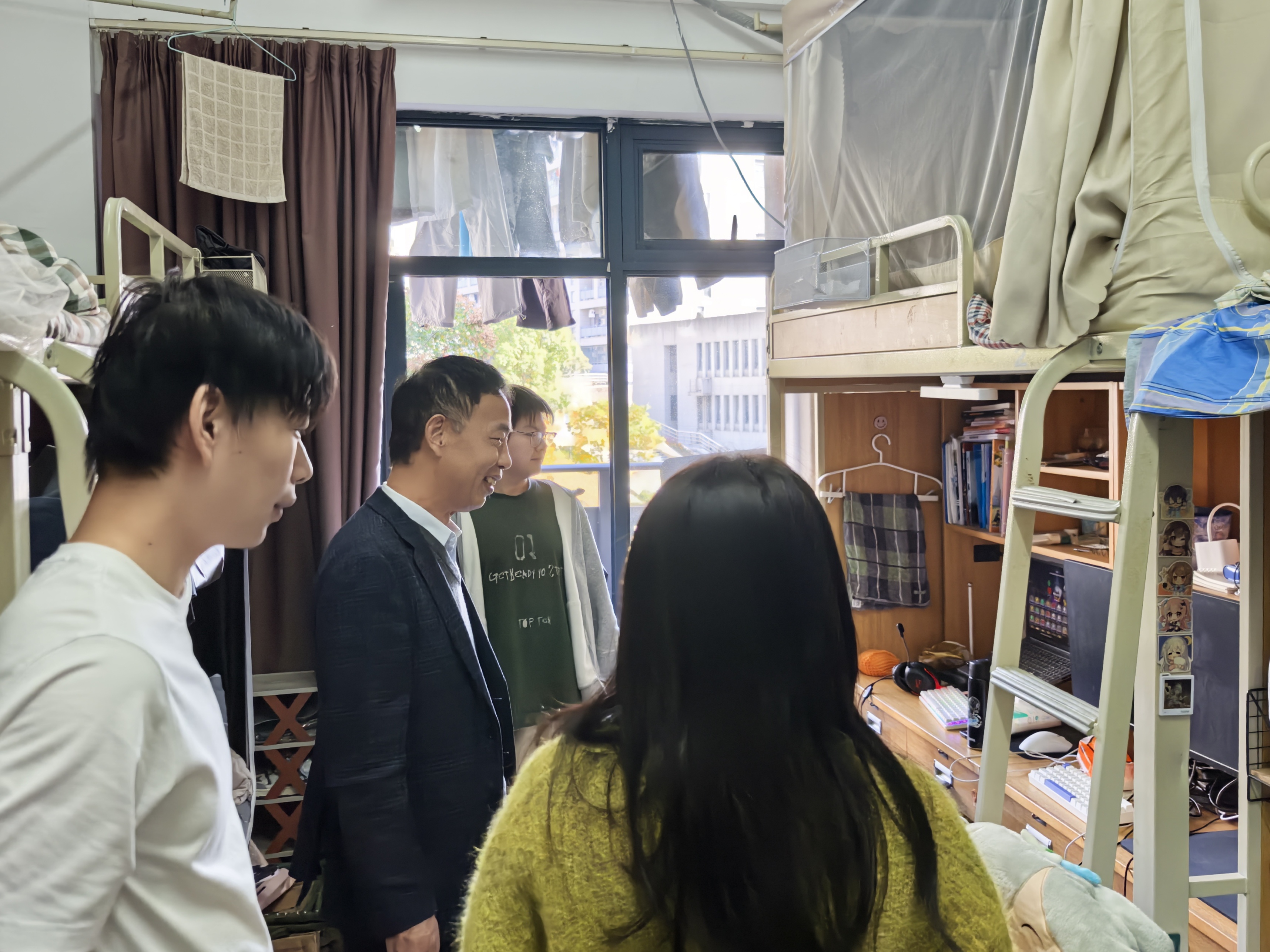 走访期间,卢文军与同学们亲切交流,细致询问大家的学习进展与生活状况,耐心解答大家的学业困惑,并鼓励同学们珍惜大学时光,夯实专业基础,做好未来规划。同行老师也与同学们热情互动,就专业发展、校园生活等话题展开交流,此外,老师们还实地查看了寝室卫生与用电安全情况,叮嘱同学们严格遵守寝室公约和校规校纪,增强安全意识,共同营造安全、整洁的生活环境。