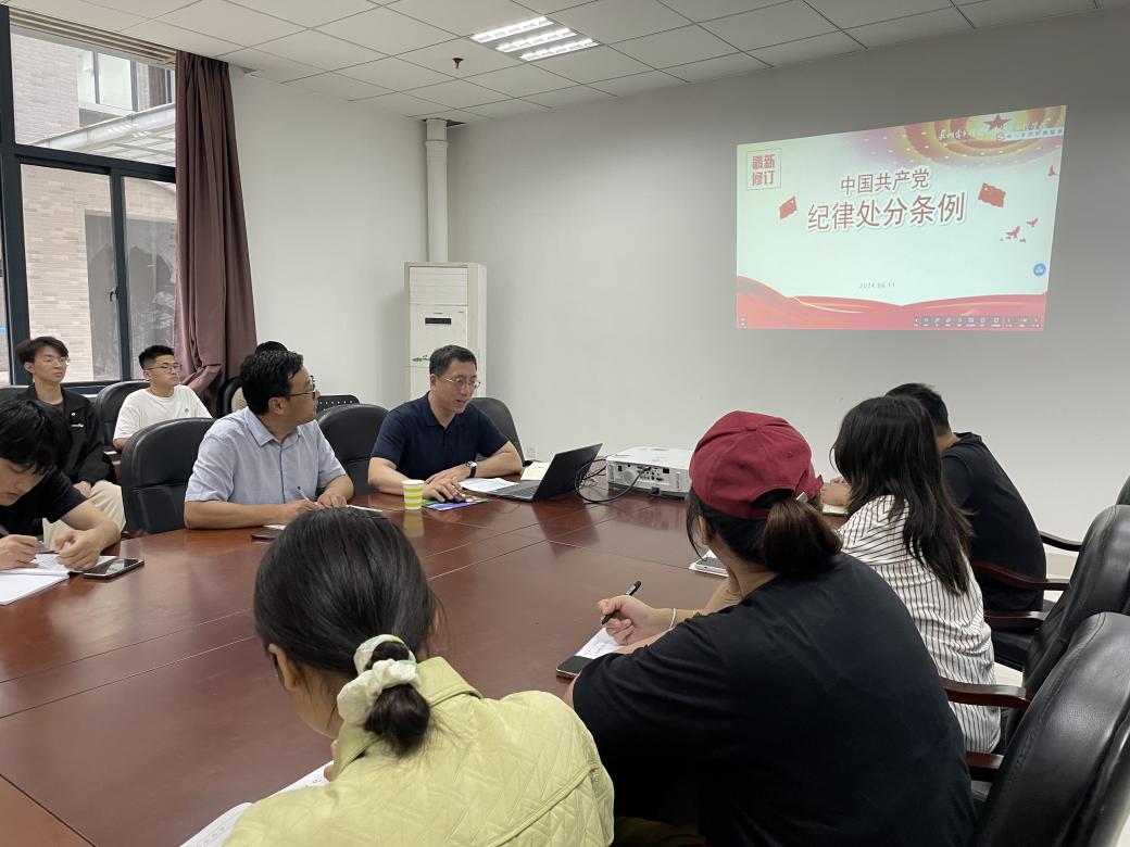 徐毅鹏副院长从《中国共产党纪律处分条例》的重要意义、基本框架、基本内容、特色亮点四个方面展开授课。介绍了《中国共产党纪律处分条例》的历史沿革和此次修订的背景,强调了新修订条例在全面从严治党中的重要作用。对条例中的重要条款进行了详细解读,特别是新增和修订的部分,如对违反政治纪律、组织纪律、廉洁纪律、群众纪律、工作纪律和生活纪律的处分规定进行了深入讲解。他指出,作为党员,必须严格遵守党的纪律,增强“四个意识”,坚定“四个自信”,做到“两个维护”。他强调,纪律是党的生命线,只有严明的纪律,才能保证党的团结统一和战斗力。各级党组织要切实担负起全面从严治党的政治责任,开展多种形式的学习和宣讲活动,使全体党员真正学懂弄通做实《条例》内容,做到内化于心、外化于行。最后,徐毅鹏副院长号召全体党员同志要以此次学习为契机,进一步增强纪律规矩意识,严格自律,做合格党员,为学校的发展和党的事业贡献自己的力量。