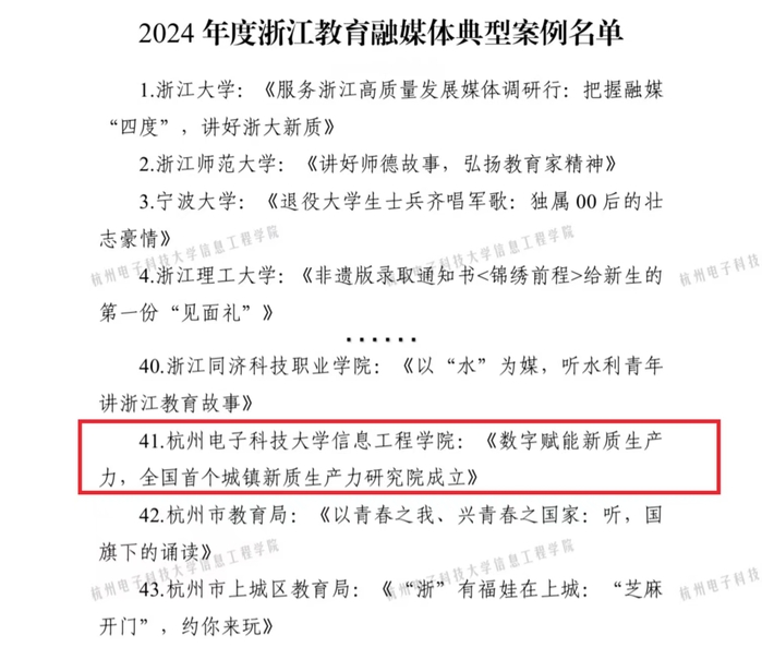 近日,浙江省教育厅开元网页版登录入口办公室、浙江省教育宣传中心发布2024年度浙江教育融媒体典型案例,我院发布的《数字赋能新质生产力,全国首个城镇新质生产力研究院成立》成功入选。