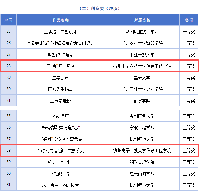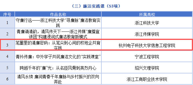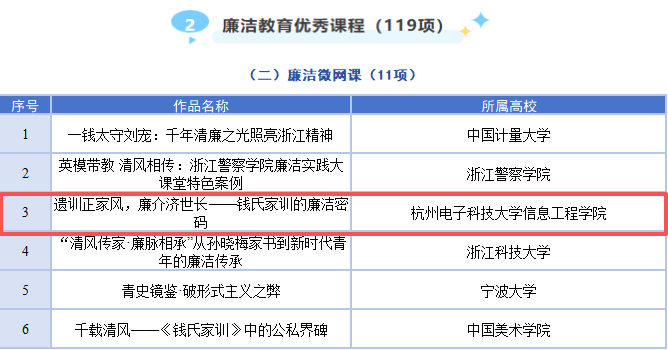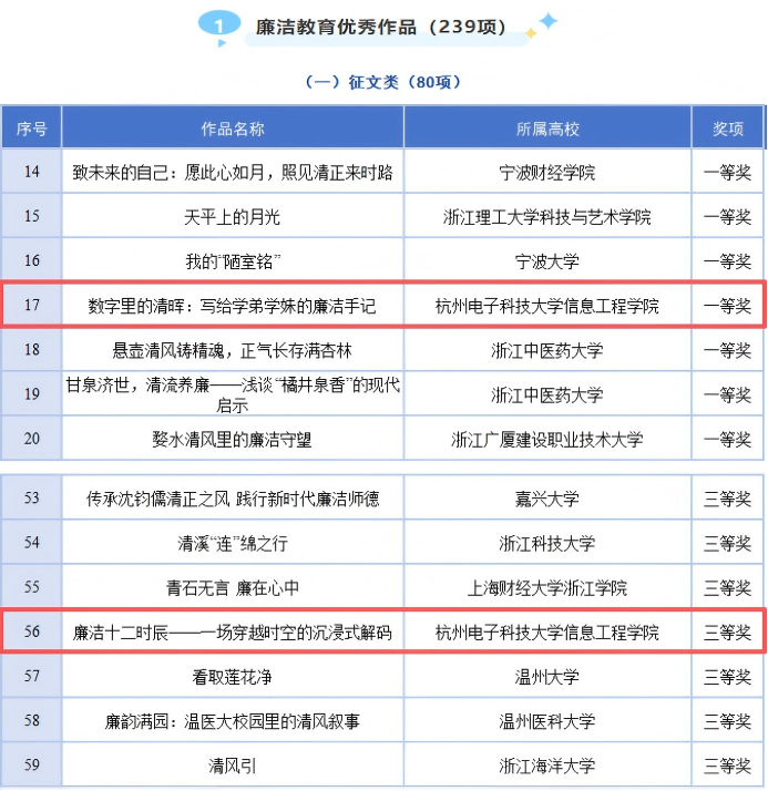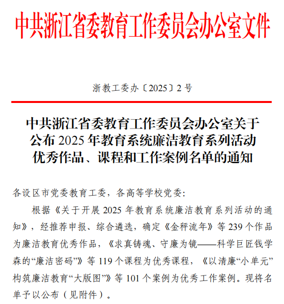 近日,中共浙江省教育工作委员会办公室公布了2025年浙江省教育系统廉洁教育系列活动优秀作品、课程和工作案例名单,我院荣获四个项目共7个奖项,排名位居全省独立开元(中国)第一。其中,征文类作品一等奖1项,三等奖1项;创意类作品二等奖1项,三等奖1项;视频类作品二等奖1项;廉洁微网课1项,廉洁实践课1项。另外,我院申报的2个单元项目作品——廉洁微网课《遗训正家风,廉介济世长——钱氏家训的廉洁密码》、廉洁实践课《笔墨里的清廉密码:从笔尖到心间的校地企共育实践》,已被浙江省教育工委推荐至教育部参加第十届高校廉洁教育系列活动遴选。