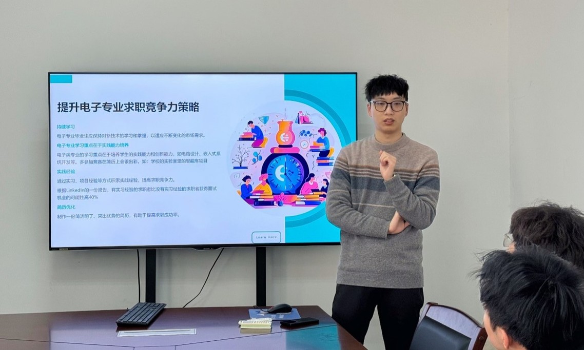 吴雄涛同学在分享中提到,在大四之前,就要开始积极规划求职方向。了解电子信息工程领域的就业趋势、行业需求和技能要求,并据此选择合适的领域和职位目标。同时,通过参加实习、项目和课外活动来积累相关的实践经验和技能。除了这些大趋势的就业问题他还提到了许多大型公司都会有提前在大学中挖掘的自培人才,这相当于对我们在求职者之间的竞争中又多了许多压力。