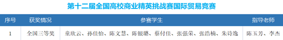 国贸专业学生获得第十二届全国高校商业精英挑战赛国际贸易竞赛全国三等奖