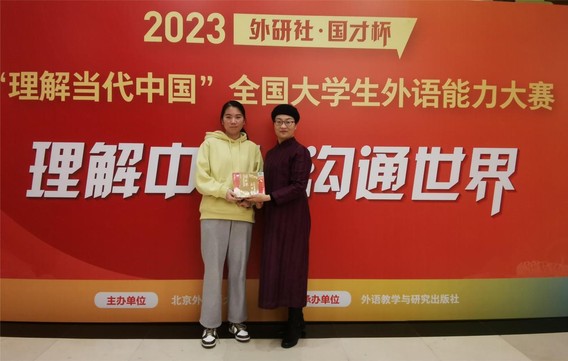 2020级英语专业李莉同学(左一)获2023“外研社·国才杯”“理解当代中国”全国大学生外语能力大赛国赛一金一铜